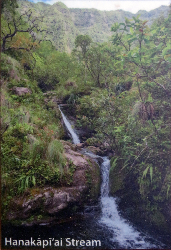 Going the other direction, one immediately enters the moku of Nā Pali (the cliffs). There is no road, only a trail. “That isn’t really a true Hawaiian trail,” Ka‘iulani says, “it was built to catch an outlaw.” She refers to the story of Ko‘olau the Leper, who fled to Kalalau in the 1890s to evade capture and quarantine on Moloka‘i. “The moku of Nā Pali is a small district facing northwest,” Carlos says, “and named for its rugged coastline of spectacular sea cliffs and hanging valleys. This name is shared by no other moku in the Hawaiian Islands.” First is the valley of Hanakāpī‘ai (“bay sprinkling food”). This small valley is accessible by the Nā Pali trail and by boat, but not by road. Smallness, yet sturdiness, appears to have been a characteristic of this valley: