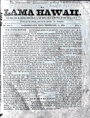 Front page of the first issue of Ka Lama Hawaii, the first Hawaiian-language newspaper.