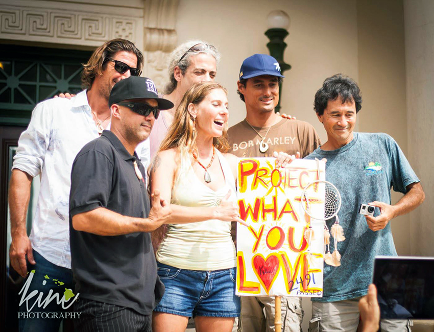 Donovan (front left) and friends celebrate Kaua‘i Bill 2491, requiring farmers to disclose pesticide use and regulating farmers who grow genetically modified crops. 2013 photo courtesty of Kit Furderer.