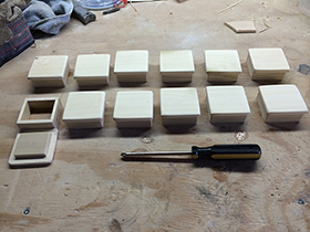 Making these puppies was tricky, because I didn't want to use any nails or screws, and it was difficult to clamp them without them parallelagramming into sandwiches. So in the end I used Contact Cement, which you put on the pieces and let dry a bit before fitting the pieces together EXACTLY. No margin of error here. That's what I did, but Contact cement is not as strong as wood glue or epoxy, so one or two of them fell apart while I was sanding them later, and had to be re-glued. Now on the real canoes, the hatch covers come down over and around the tops of the hatches, to keep water out. That was not feasible, so I made ones that sat on top with an inset to keep them in place. Problem was, each hatch was a slightly different shape. So each hatch cover was custom-fit. I then marked hatches and their matching covers with Roman numerals, to keep them straight.