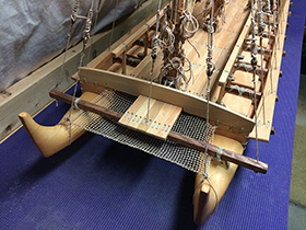 To finish this model, I needed some miniature netting. This was nearly impossible to find. I finally discovered a company that makes the netting for filet lace. This netting comes in a variety of sizes, and I got the smallest size they had, I think seven holes to an inch. This seemed to match what I saw in my photos of Hokulea. I did my best to attach these, front and back, even making the nice semi-circular hole for the steering paddle.