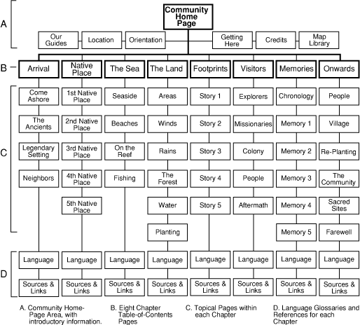 Orientation to the Website: (A) The Pacific Worlds Home-Page is the pivot-point for reaching other portions of the website, and contains pages with general information about the project, including educational resources. From here, one can go directly to specific Community Websites either by clicking hot-spots on the map, or selecting from the drop-down menu. Whenever you want to get to the Pacific Worlds Home Page, click on our turtle logo. Remember: "the turtle always takes you home." (B) The Community Websites are connected to the home page. Each of community website is a complete and detailed presentation of a local community in the Pacific, which are chosen to be representative of their larger island context. A Community website is composed of an introductory section, which introduces the location, the community participants, an orientation to the land division, and provides an “entry” to the location, as though you had flown in and had to make your journey to this area. There is also a site map and a “map library” for each Community Website, as well as a list of credits for all those who contributed to producing that community’s website. (C) These Community Websites are broken into eight chapters. The chapters